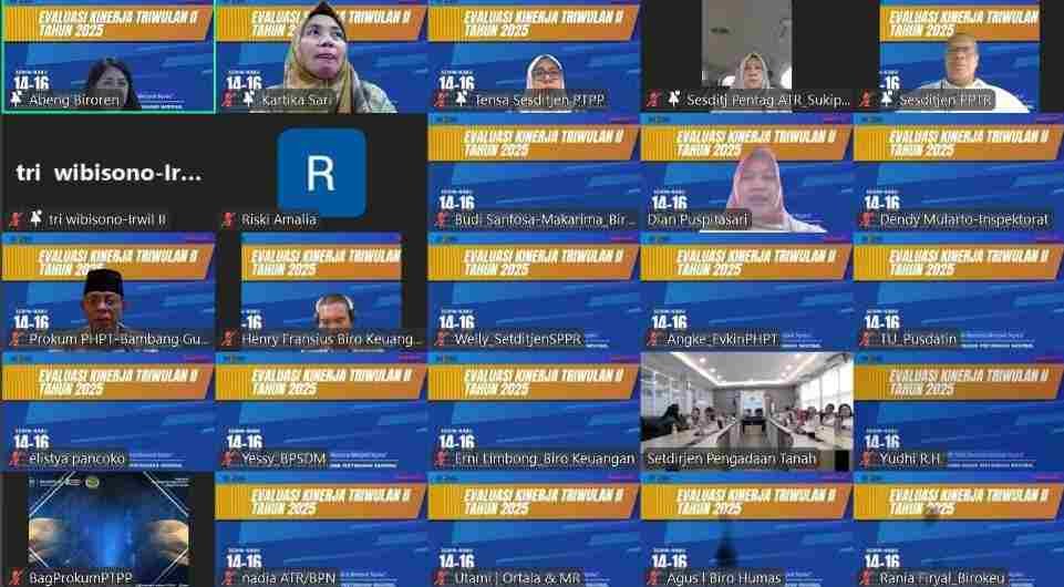 Evaluasi kinerja ini turut diikuti oleh jajaran pejabat kementerian secara daring, termasuk Kepala Biro Hukum Nugraha, Kepala Pusdatin I Ketut Gede Ary Sucaya, Inspektur Wilayah II Tri Wibisono, serta Ketua Sekolah Tinggi Pertanahan Nasional (STPN), Sri Yanti Achmad.