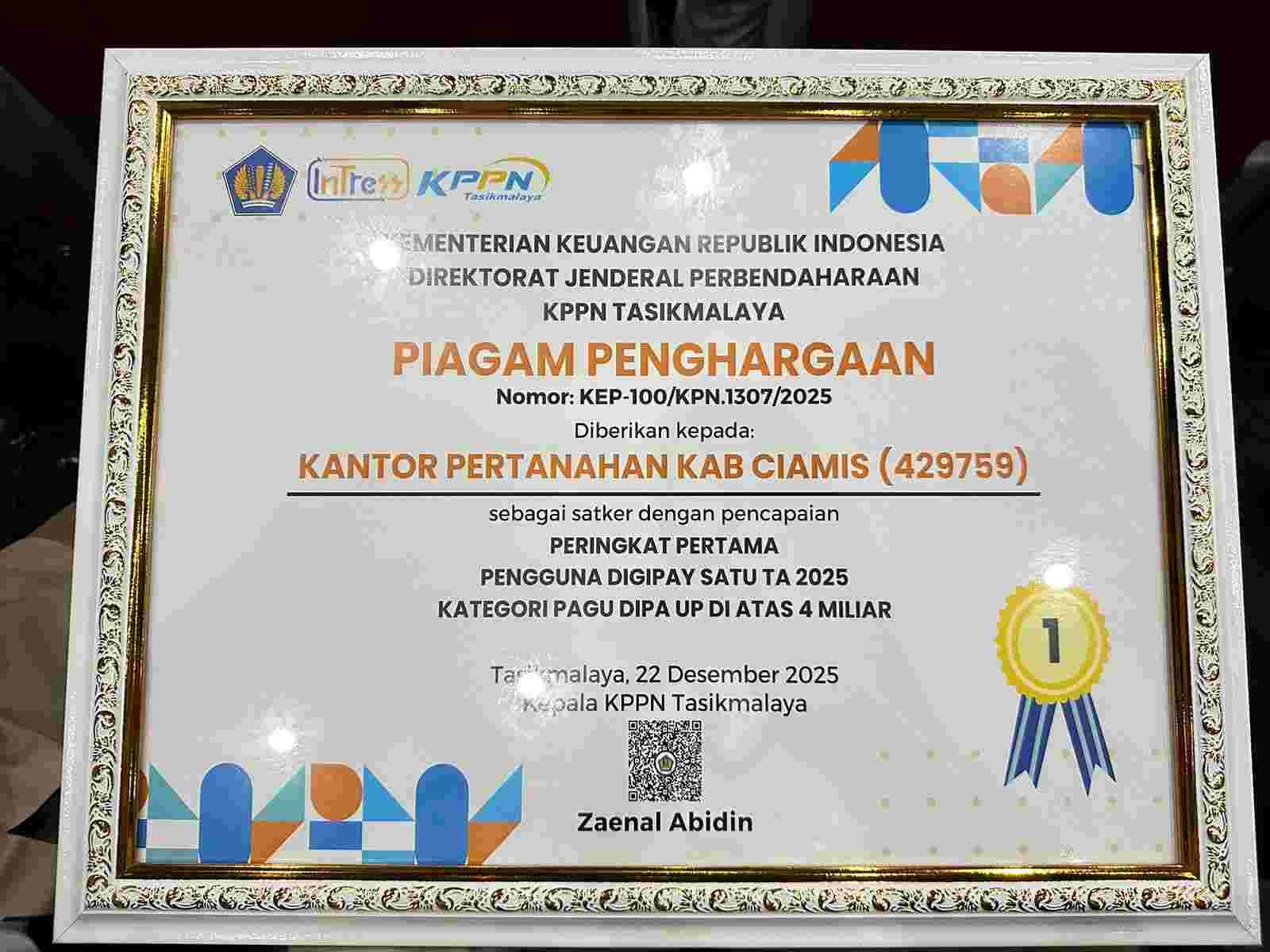 Penghargaan ini mencerminkan keberhasilan Kantor Pertanahan Kabupaten Ciamis dalam mengoptimalkan pemanfaatan transaksi non-tunai melalui Digipay Satu sebagai bagian dari transformasi digital pengelolaan keuangan pemerintah sepanjang Tahun Anggaran 2025.